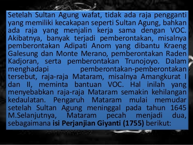 - Perjanjian Giyanti : Mataram dibagi 2. Kasultanan Yogyakarta kepada Hamengkubuwono I dan kesuhunan Surakarta kepada Pakubuwono III.